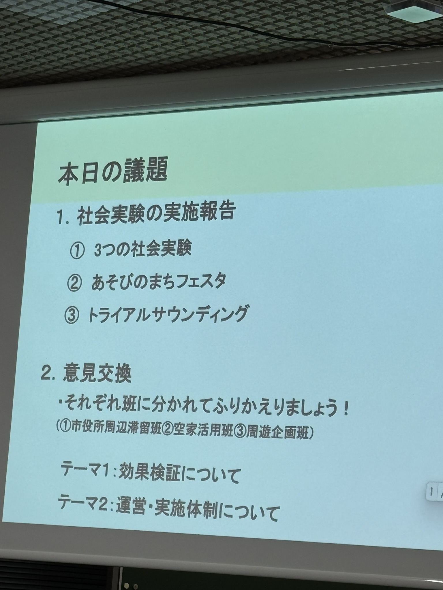 会議では①市役所・駅前滞留班②空き地空き空間班③周遊企画班の3班に分かれてそれぞれアイデアを出し実施に向けて検討されました。