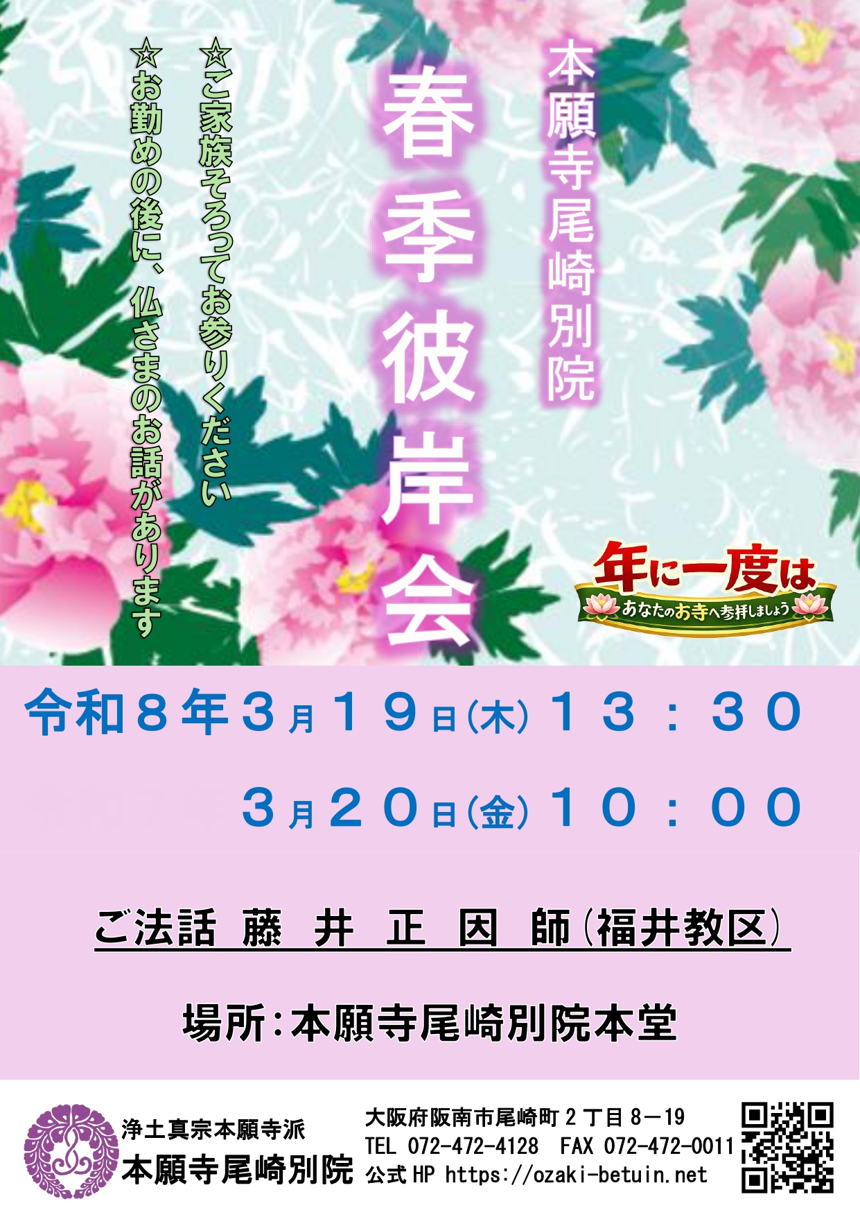 当院でもこの期間、ご門徒さまのお宅にお参りにお伺いいたしますが、下記の日程で当院本堂で春季彼岸会をお勤めいたします。