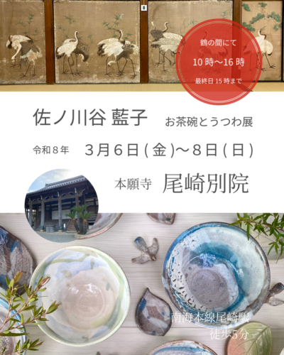 先日ご案内いたしました、阪南市在住の陶芸家 佐ノ川谷 藍子(さのがわや あいこ)さんの個展を当院対面所(通称:鶴の間)において開催しています。