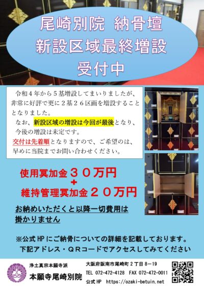 今後、さらに増設をする場合は、境内に納骨堂を建設するか、既存の建物の一部を改修する必要があり、さらに近年の物価高、激変する世界情勢などに鑑みると、交付額も増額せざるを得ません。